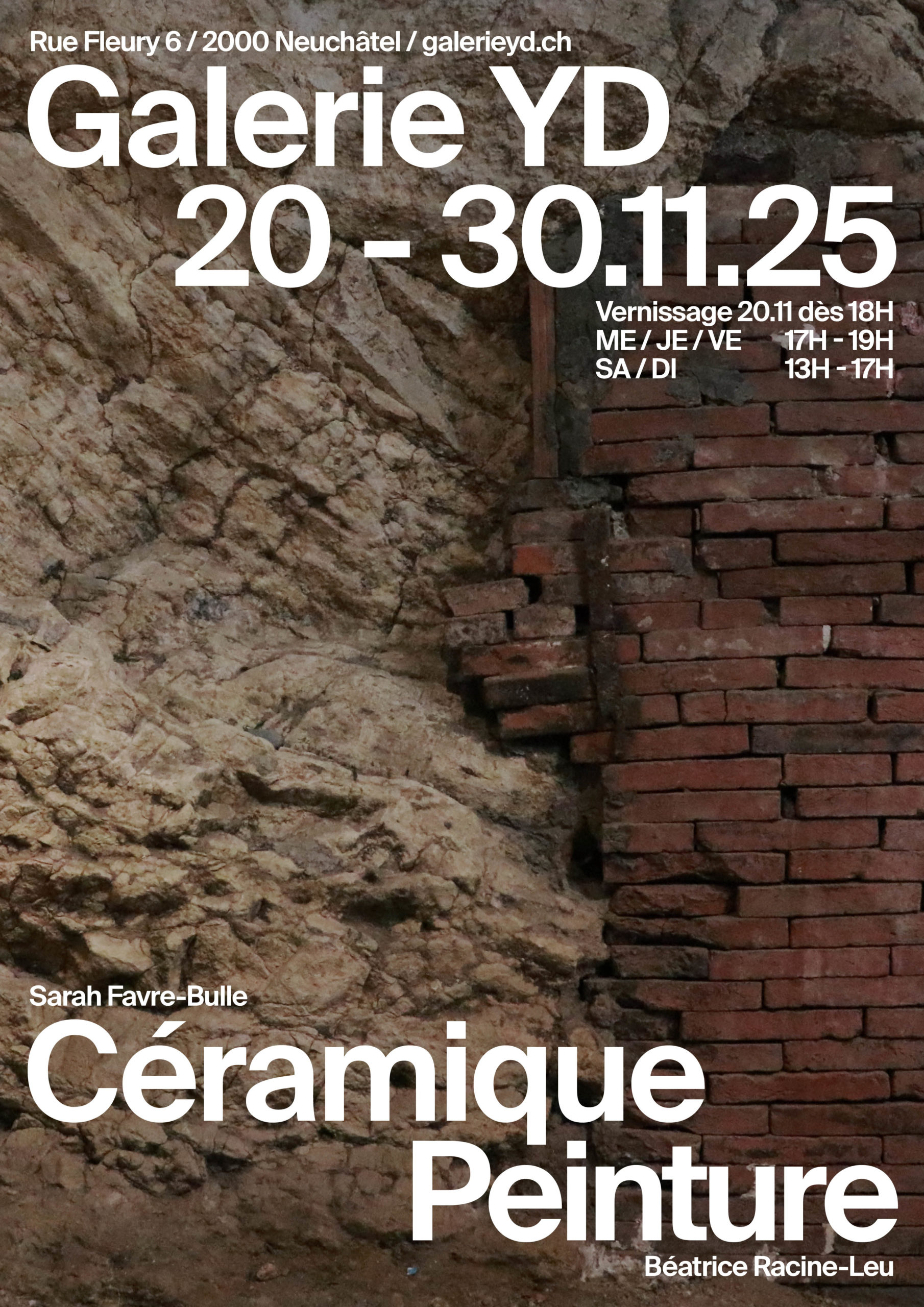 Exposition Céramique et Peinture Sarah Favre-Bulle CERAMIQUE Béatrice Racine-Leu PEINTURE Date 20 - 30 Nov 2025 Heure 18 h 00 min - 17 h 00 min Catégorie Exposition Littérature